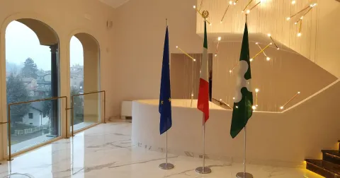 Sempre al piano superiore è presente una luminosa sala riunione, con ampie vetrate sulla piazza della fontana, servita da un grazioso bar, utile negli intervalli di lavoro.